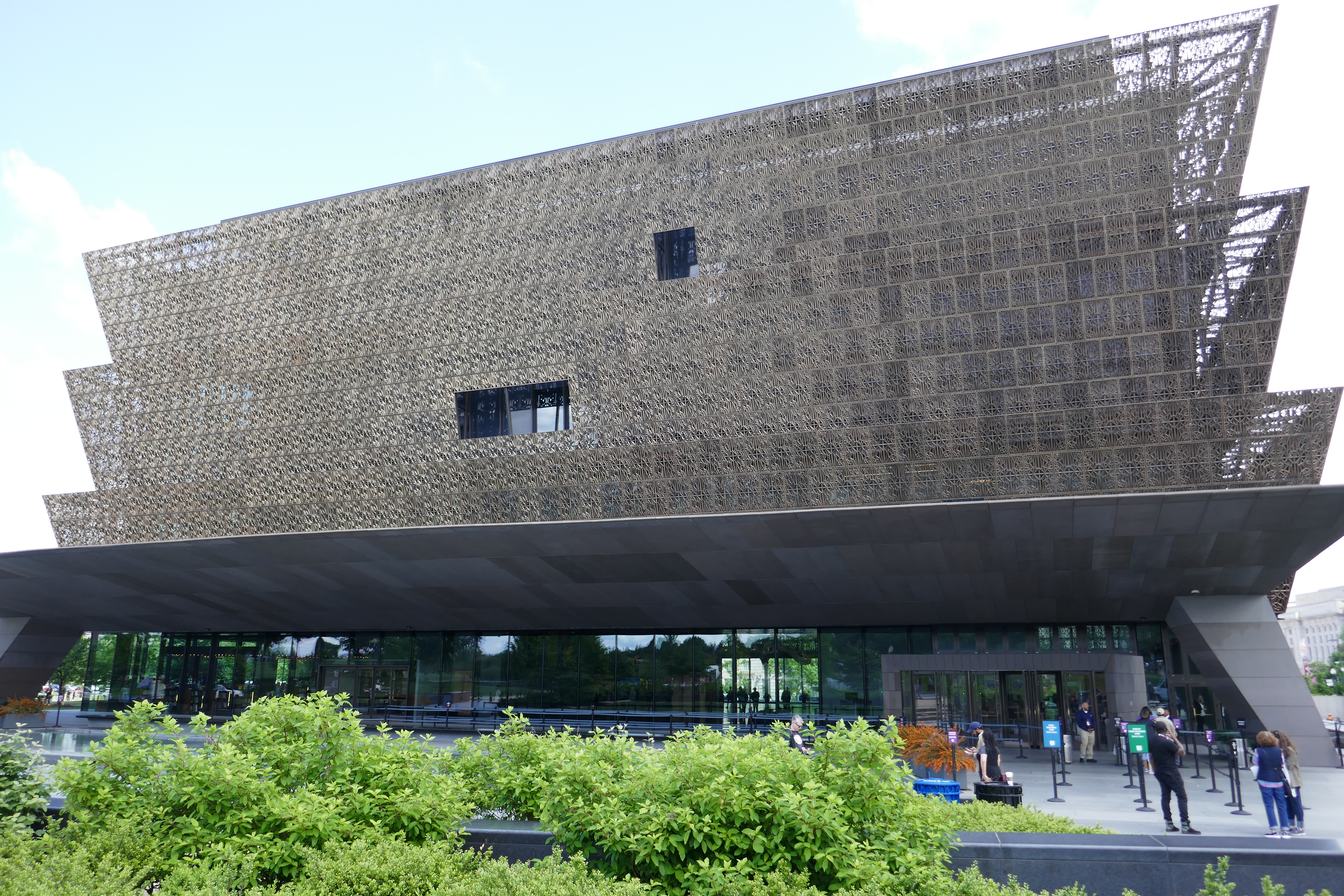 A view of the new National Museum of African-American History and Culture. The architecture, with its outer shell of sculpted metal and landscaped grounds, is exquisite. The curation on the interior is amazing, and tells the story of African-Americans from 1400 (the start of the Atlantic Slave Trade) to near the present day. A must-visit, and should be required viewing for all Americans and Europeans.